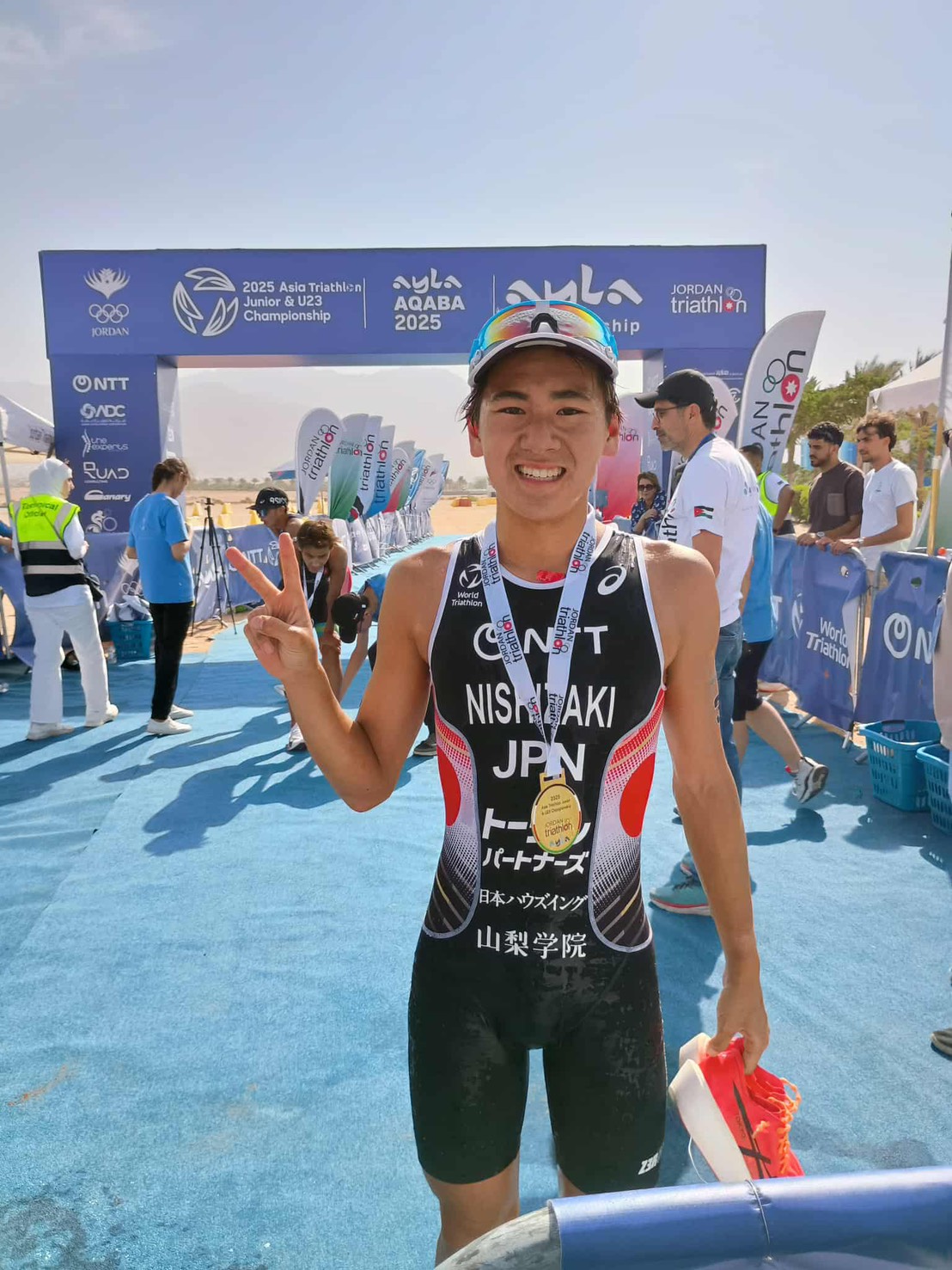 A&Aスイミングスクール・選手コース出身の西﨑大貴君(山梨学院高校2年・チームケンズアカデミー)は、10月31日にヨルダン/アカバで開催されたアジアトライアスロン選手権2025男子ジュニアの部で見事優勝を果たしました。